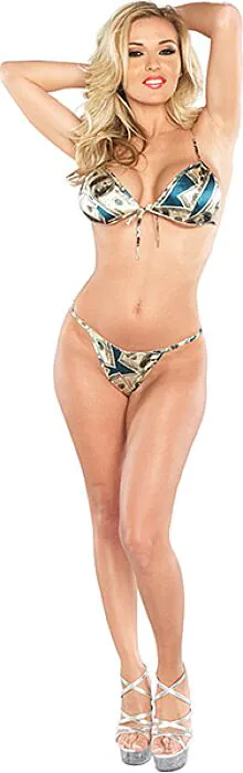 Dieses zweiteilige Set von Exposed ist für dich, wenn du etwas Originelles suchst, das locker sitzt und Aufmerksamkeit erregt: ein bügelloser BH aus feinem Material mit auffälligem Dollarnoten‑Print und ein passender String. Der BH verzichtet auf Bügel und nutzt Bindebänder, um sich dem individuellen Kontur und Volumen der Brust anzupassen — das heißt mehr Flexibilität beim Tragen, aber weniger formende Unterstützung als ein modellierender Unterbrust‑BH.