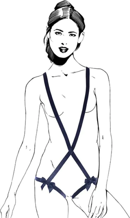 Dieses Body-Strap ist ein verstellbares, elastisches Harness aus dem Material "Blue Velvet". Im Laden erkläre ich Kunden: das Teil ist dazu gedacht, die Silhouette zu betonen und spielerisch Signalwirkung zu haben — enganliegend, weich und nachgiebig. Weil es elastisch ist, passt es vielen Körperformen und setzt Hautpartien in Szene, ohne harte Kanten oder Schnallen.