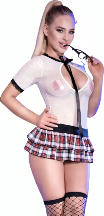 Ein fesselndes Schulmädchen-Outfit, das die Figur betont und gleichzeitig mit einem Hauch von Unschuld spielt. Der zarte, weiße Netzstoff sorgt für eine verführerische Ausstrahlung, während die zarte Spitze Eleganz verleiht.