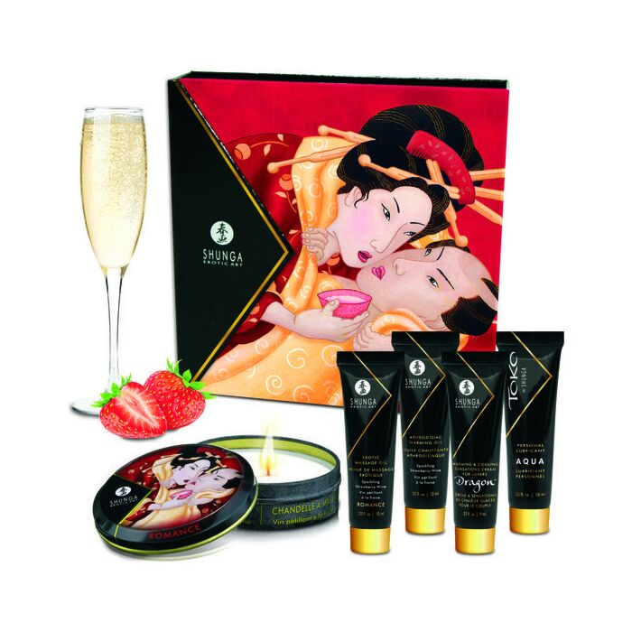 Tauchen Sie ein in eine Welt voller Sinnlichkeit und Leidenschaft mit der exklusiven Shunga Geisha Sparkling Wine Collection! Entdecken Sie die Kunst des Vergnügens, inspiriert von der Eleganz der alten japanischen erotischen Gemälde. Dieses Set lädt Sie ein, neue Dimensionen der Erotik zu erkunden mit: - **Erotisches Massageöl**: Köstlicher Duft nach Erdbeeren und Sekt für sinnliche Massagen. - **Aphrodisierendes Wärmeeffekt-Öl**: Intensivieren Sie Ihre intimen Momente mit angenehmer Wärme. - **Massagekerze Romance**: Schaffen Sie eine romantische Atmosphäre mit warmem Massageöl. - **Toko Wasserbasiertes Gleitmittel**: Sanfte und langanhaltende Schmierung für maximalen Genuss. - **Orgasmus-Verstärker-Gel Dragon**: Steigern Sie Ihre Orgasmen und erreichen Sie neue Höhen der Ekstase. Mit ausgewählten natürlichen und aktiven Inhaltsstoffen regen diese Produkte Ihre Sinne an und wecken Ihr tiefstes Verlangen. Ideal für den Solo- oder Paargenuss lädt Sie diese Kollektion ein, neue Empfindungen zu entdecken und das Vergnügen in seiner reinsten Form zu erleben. Lassen Sie sich von Shunga mitnehmen und erleben Sie unvergessliche Momente der Intimität und Verbundenheit!