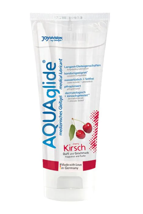 Wasserbasiertes Gleitgel von JOYDIVISION AQUAGLIDE mit Kirschgeschmack – medizinisch getestet und für empfindliche Haut geeignet. Bietet lang anhaltende Gleiteigenschaften, ist fettfrei, leicht abwaschbar und 100% kondomkompatibel. Gut für den Einsatz mit Sexspielzeug und beim Liebesspiel, wenn du ein hautverträgliches, geschmacksoptimiertes Gleitmittel suchst.