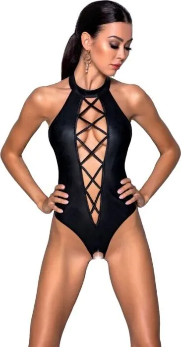 Der Teddy Nancy vereint Eleganz und Sinnlichkeit durch sein schwarzes Leder und den tiefen Ausschnitt. Indicado für Frauen, die Komfort und Stil schätzen.