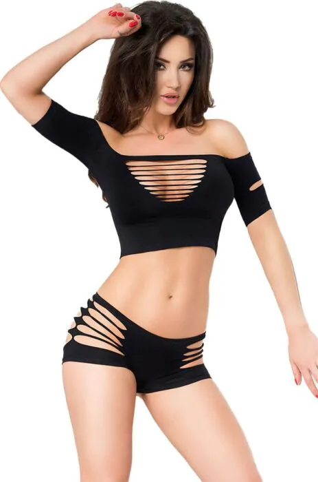 Feminines 2-teiliges Set aus elastischem, weichem Material. Die strategischen Öffnungen sorgen für eine angenehme Belüftung und verleihen dir einen Hauch von Verspieltheit.