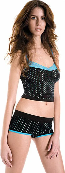 Elegantes Top mit verführerischen Spitzendetails und Shorts im modischen Tupfenmuster. Empfehlenswert für besondere Anlässe oder einfach zum Verwöhnen.