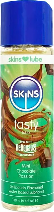 Aromatisches, wasserbasiertes Gleitgel von SKINS mit natürlichem Minze‑und‑Milchschokolade‑Geschmack (130 ml). Reaktivierbare Textur dank Skins Reaquav8: ein kurzer Spritzer Wasser oder ein leichtes Lecken macht das Gel wieder gleitfähig. Gut für Paare und für Orale Spielereien; kompatibel mit Latex und Sexspielzeug. Vegan und nicht fleckend.