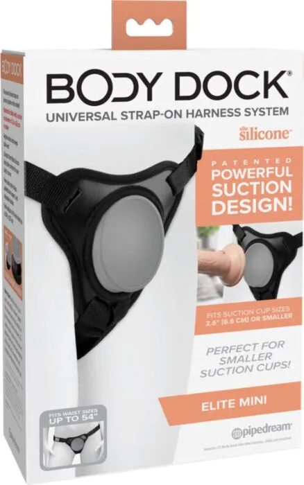 Der Body Dock Elite Mini kombiniert Sicherheit und Komfort mit einem einzigartigen Saugmechanismus. Ideal für Dildos mit kleinerem Durchmesser. Die verstellbaren Riemen sorgen für einen bequemen Sitz.